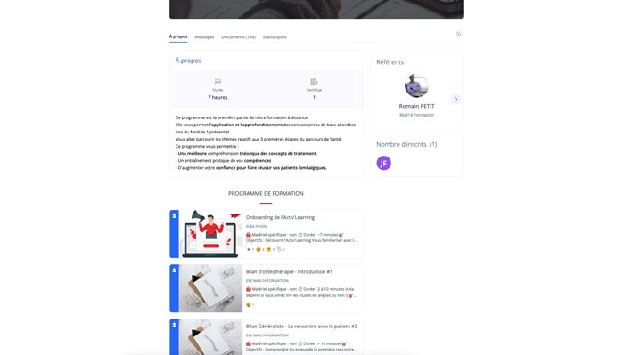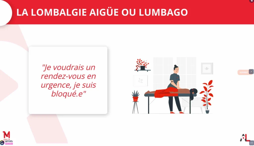 Conçue pour les masseurs-kinésithérapeutes déjà formés à la méthode École du Dos, cette formation en e-learning permet de vous replonger dans les trois premières étapes du parcours de santé et de vous permettre de les mettre en pratique concrètement, directement depuis chez vous.