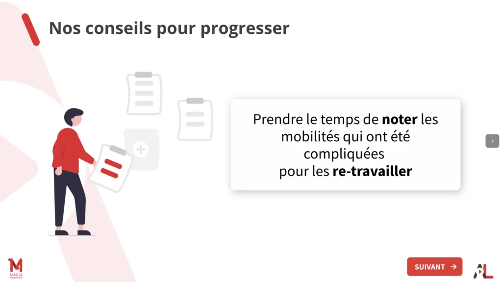 Un apprentissage progressif d’environ 30 minutes par semaine, pensé pour s’intégrer à votre quotidien et favoriser un ancrage durable des compétences. - Une mise en pratique e-learning du Module 1
