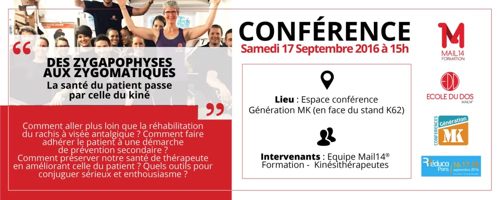 Thème de la conférence : Comment aller plus loin que la réhabilitation du rachis à visée antalgique ? Comment faire adhérer le patient à une démarche de prévention secondaire ? Comment préserver notre santé de thérapeute en améliorant celle du patient ? Quels outils pour conjuguer sérieux et enthousiasme ?